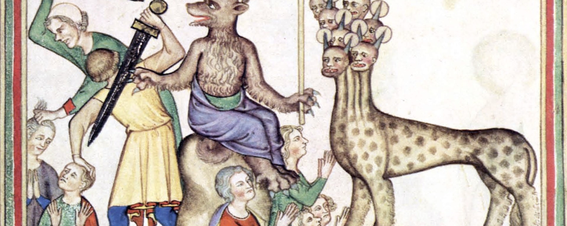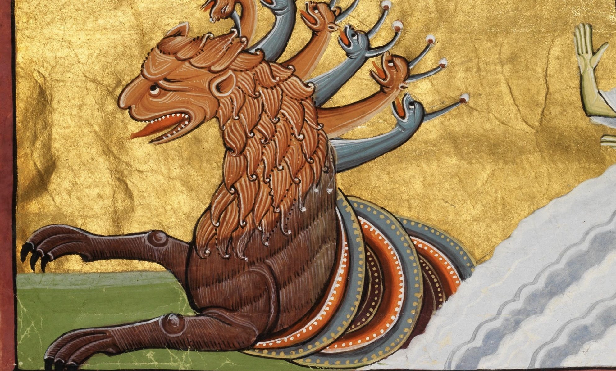 „Und ich sah: Ein Tier stieg aus dem Meer, mit zehn Hörnern und sieben Köpfen. Auf seinen Hörnern trug es zehn Diademe und auf seinen Köpfen Namen, die eine Gotteslästerung waren. Das Tier, das ich sah, glich einem Panther; seine Füße waren wie die Tatzen eines Bären und sein Maul wie das Maul eines Löwen.“