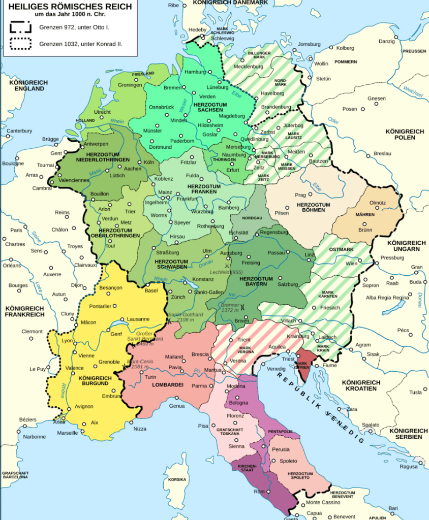 Die Kaiserwürde geht im zehnten Jahrhundert auf den östlichen der drei Teile, in die das Frankenreich nach dem Tode Karl des Großen zerfiel, über.